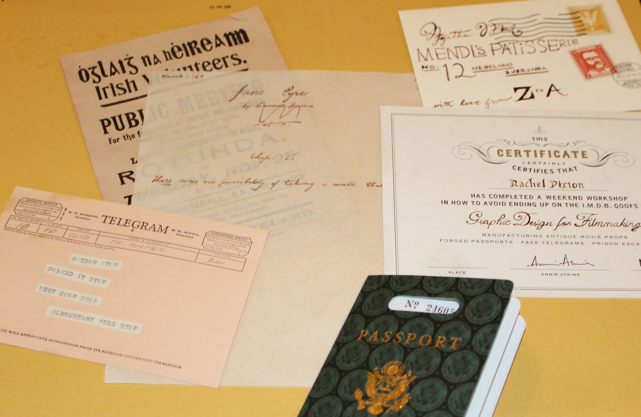 Pictured below: A telegram, an example of paper dyeing, a replica of the first chapter of Jane Eyre on aged paper, Marilyn Monroe's passport, an envelope from the Grand Budapest Hotel movie, and an official certificate of workshop completion.